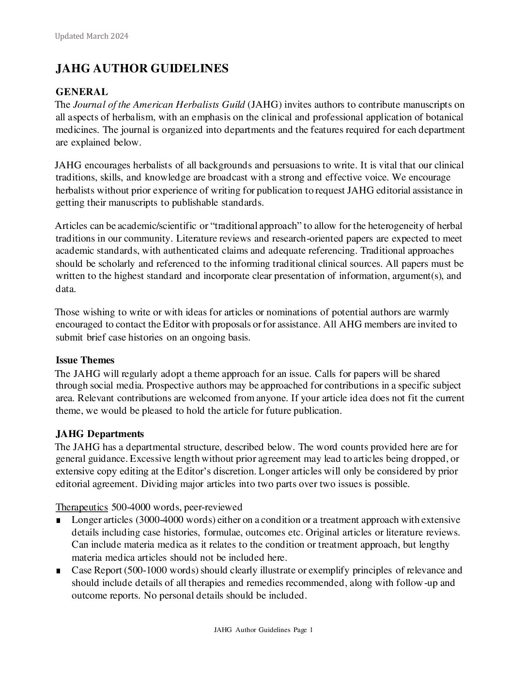Calling all herbalists! We are seeking submissions for the Fall 2022 issue of the Journal of the American Herbalist Guild. We invite authors to contribute manuscripts on all aspects of herbalism with an emphasis on the clinical, historical, and professional application of botanical medicines. We encourage herbalists of all persuasions to submit pieces for the journal, with the hope to especially elevating the voices of racialized, queer/trans/non-binary, and chronically ill/disabled herbalists globally. We accept manuscripts on a variety of topics, ranging from short pieces such as book reviews or case studies to longer peer-reviewed articles on therapeutics, materia medica, and ethnobotany. Check out the following submission guidelines for more information about accepted topics and word limits: https://americanherbalistsguild.com/wp-content/uploads/2024/01/jahg_author_guidelines_2024.pdf